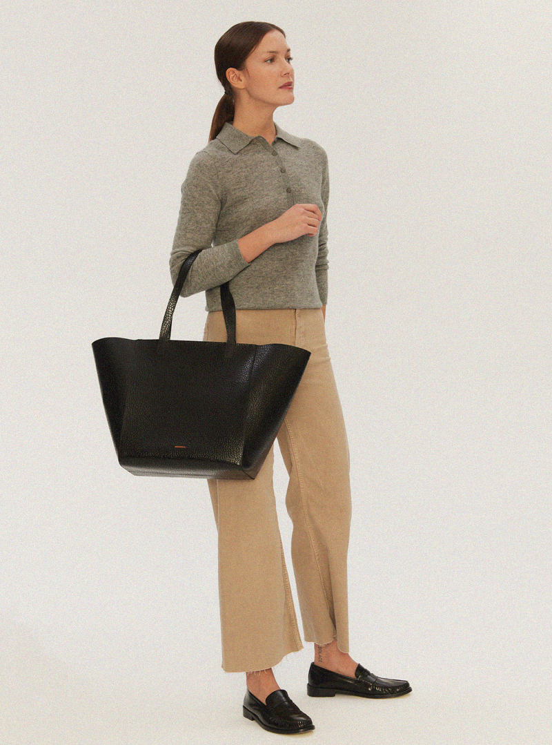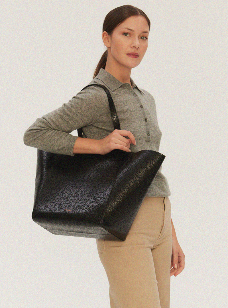 Shopper bag handmade from high-quality cowhide leather embossed with an irregular fine pattern. Very spacious and perfect for everyday use. The bag fastens at the top with a copper zip and is complete with a removable pouch. You can wear it in two ways, by hand or over the shoulder. Logo in copper color embossed at the bottom edge.