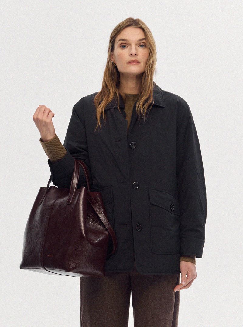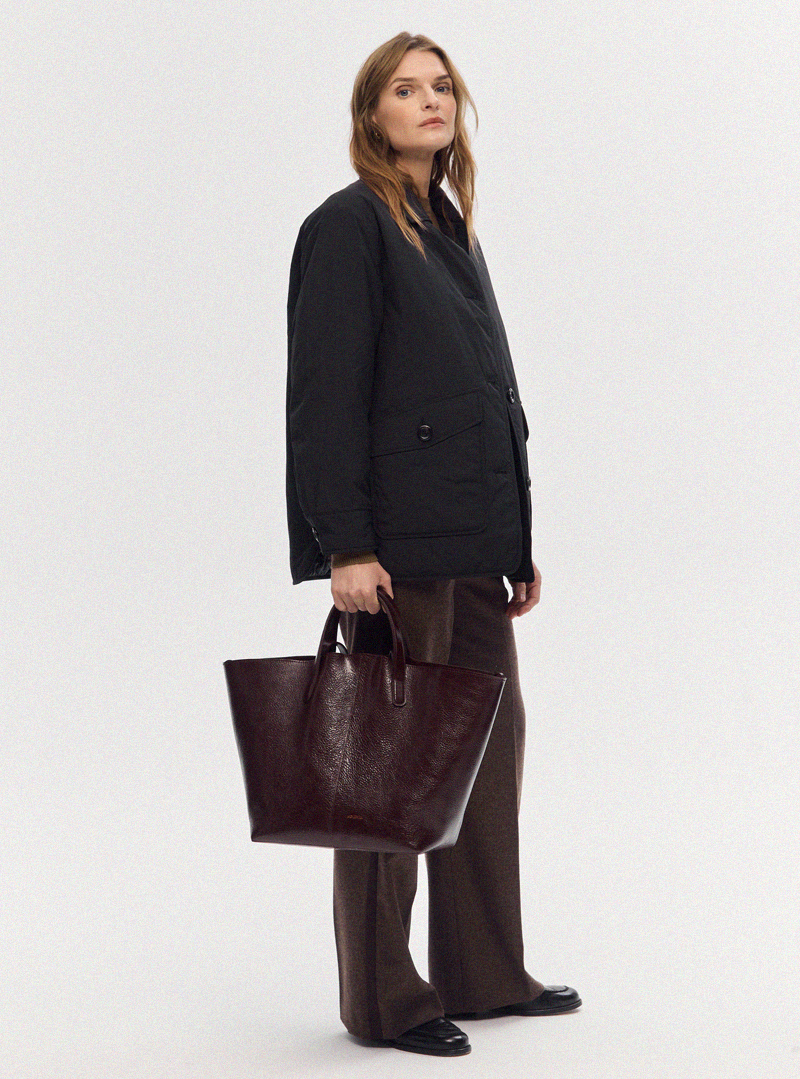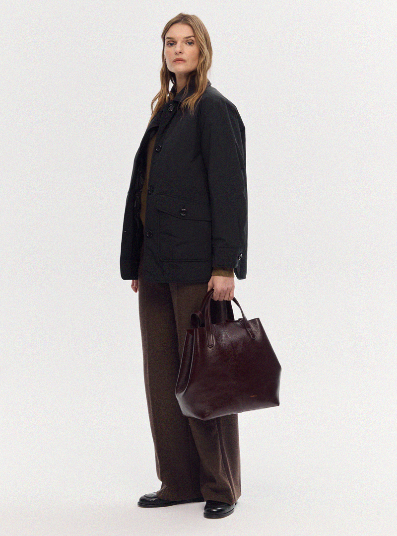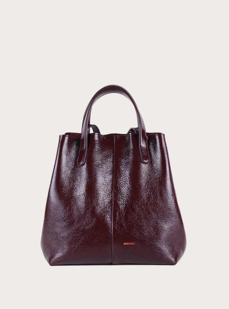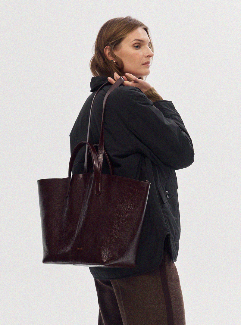 BALLOON shopper bag handmade from high-quality shiny milled cowhide vegatable tanned. Perfect for everyday use. It has one compartment and stiffened handles. The bag fastens with a magnet and leather straps. You can wear the bag on the shoulder or by hand. Logo in copper color embossed at the bottom edge.