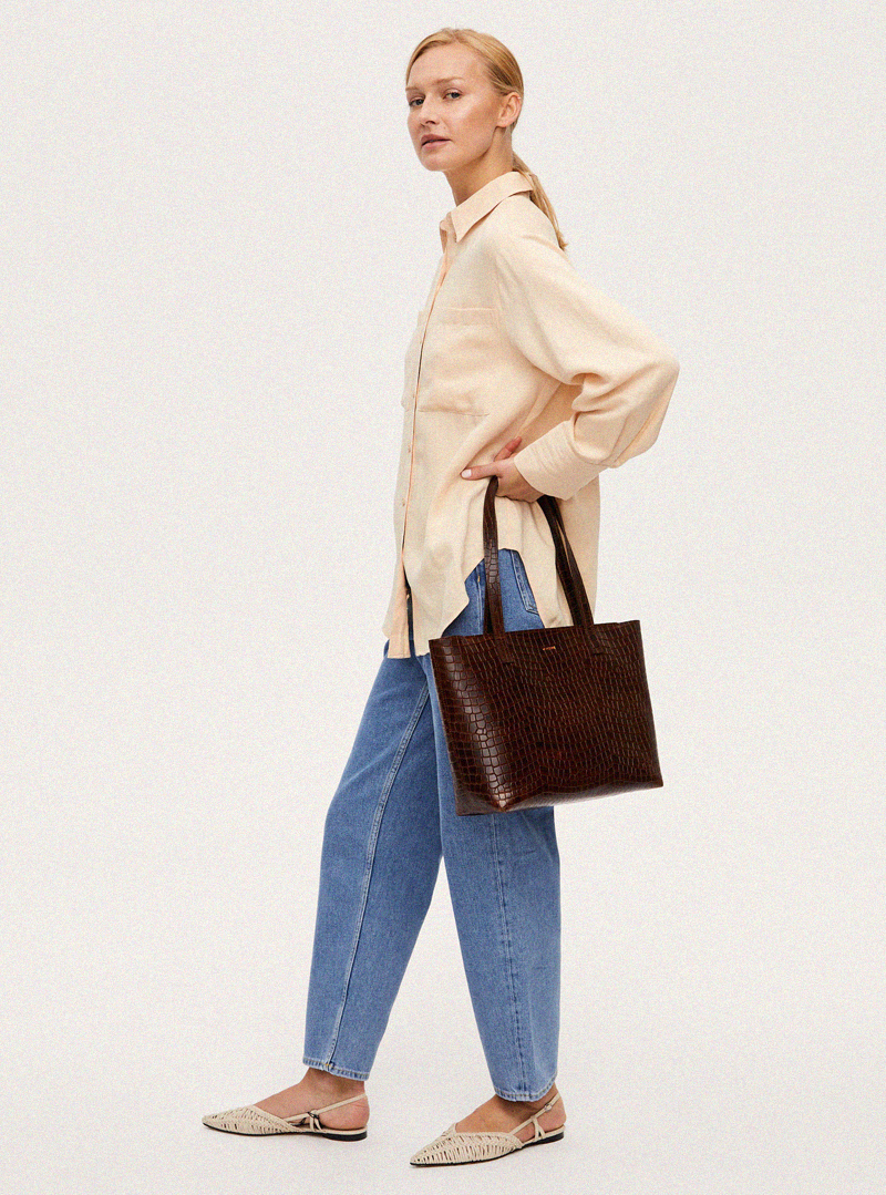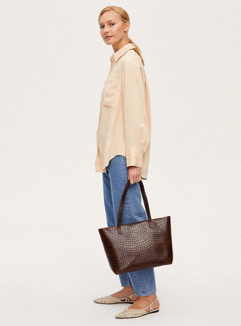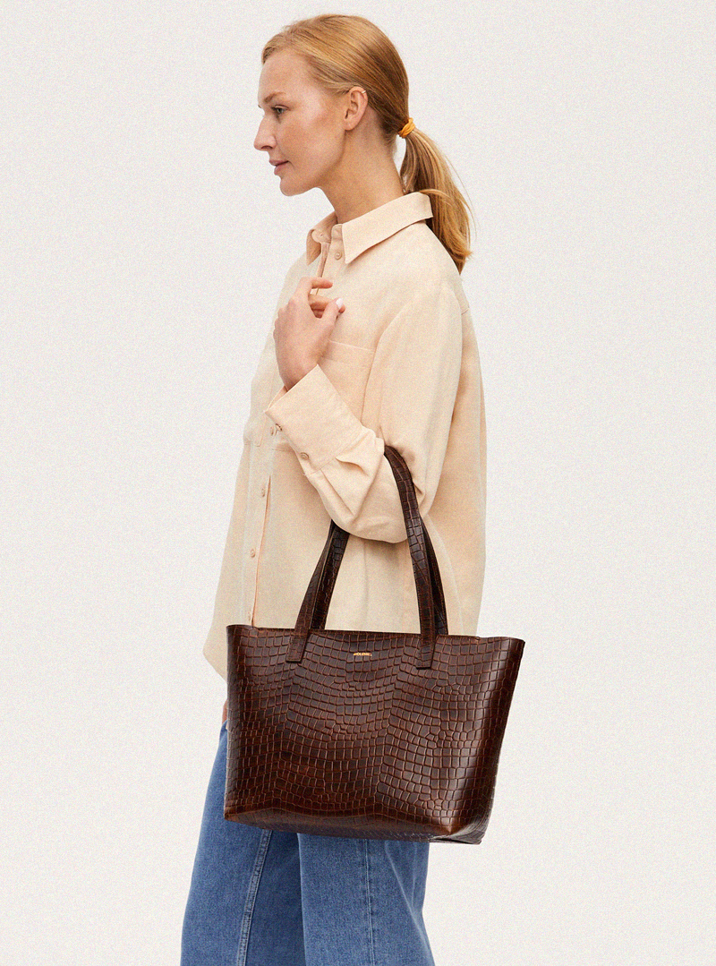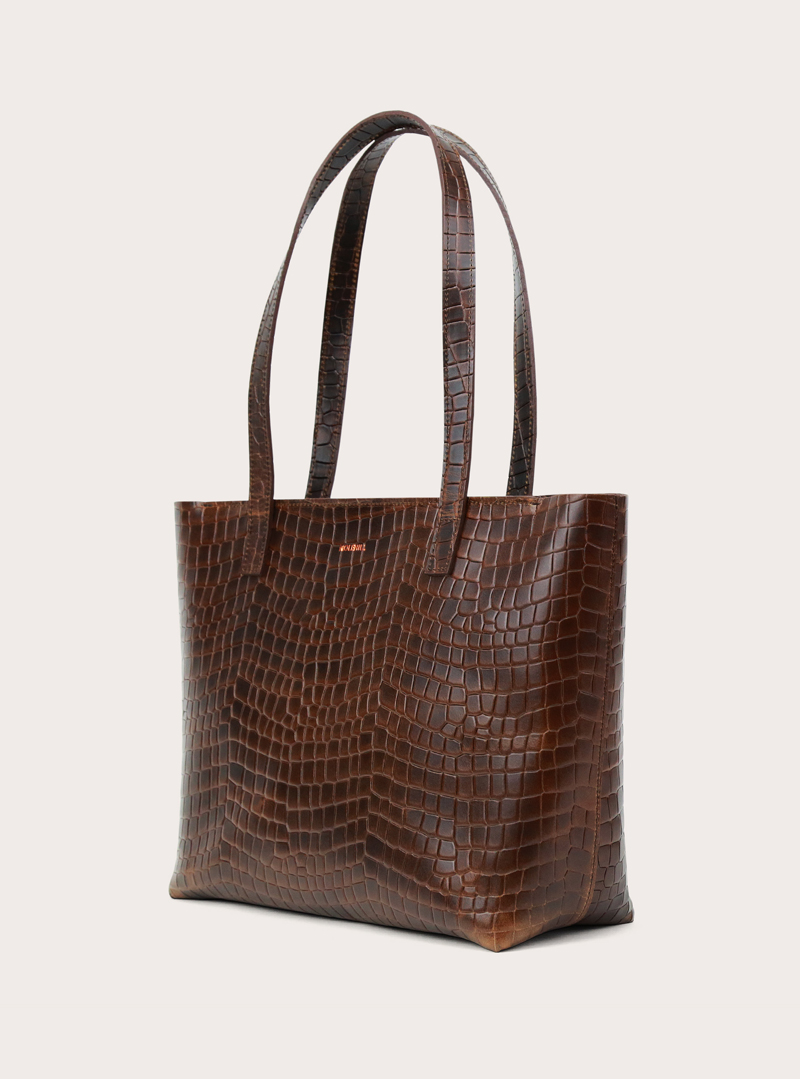 Everyday bag handmade from high-quality cowhide leather embossed with a crocodile skin pattern. Perfect for everyday use. The bag fastens at the top with a copper zip. You can wear it in two ways, by hand or over the shoulder. Internal pocket, logo in copper color embossed at the top edge.