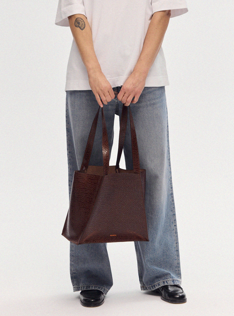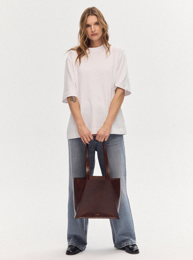 The bag can be carried on the shoulder or in hand. Worn as a sac or a shopper, it creates an open form, while the folded sides close the bag from the top.