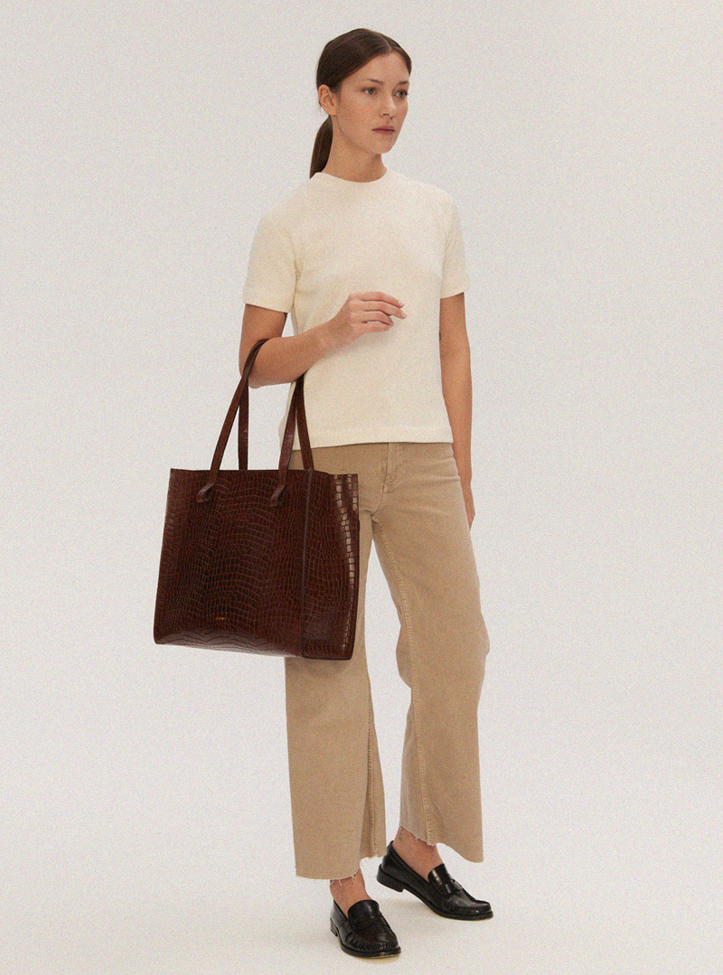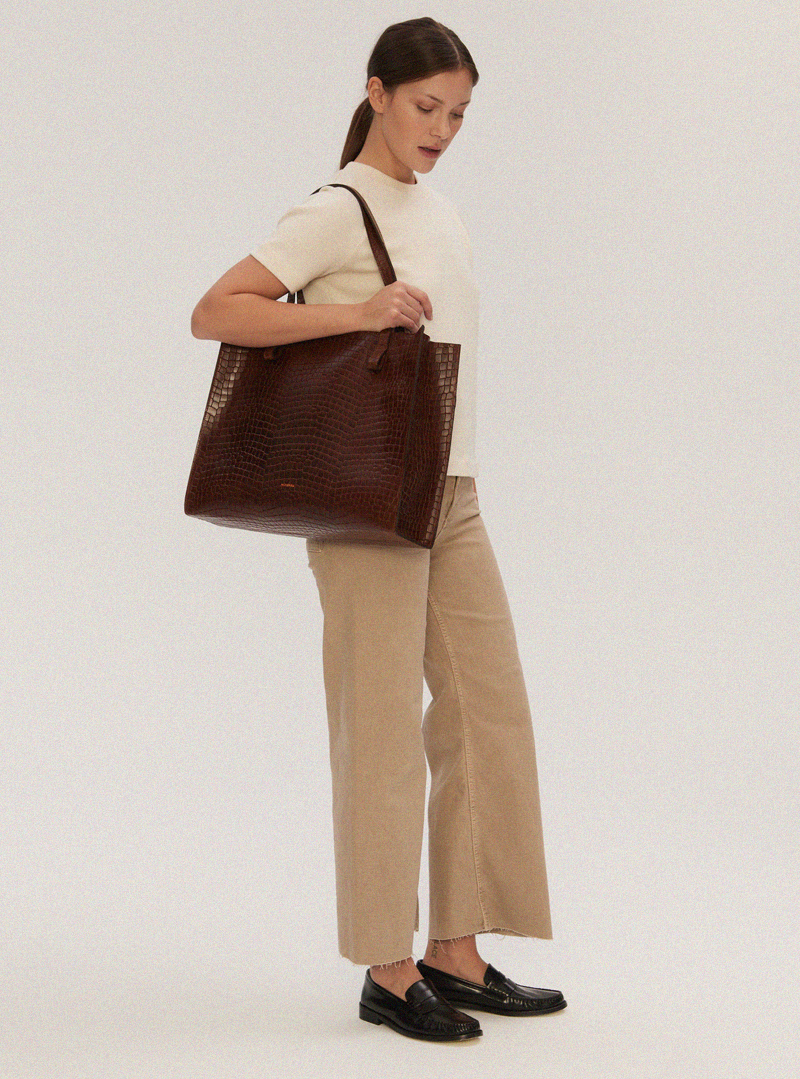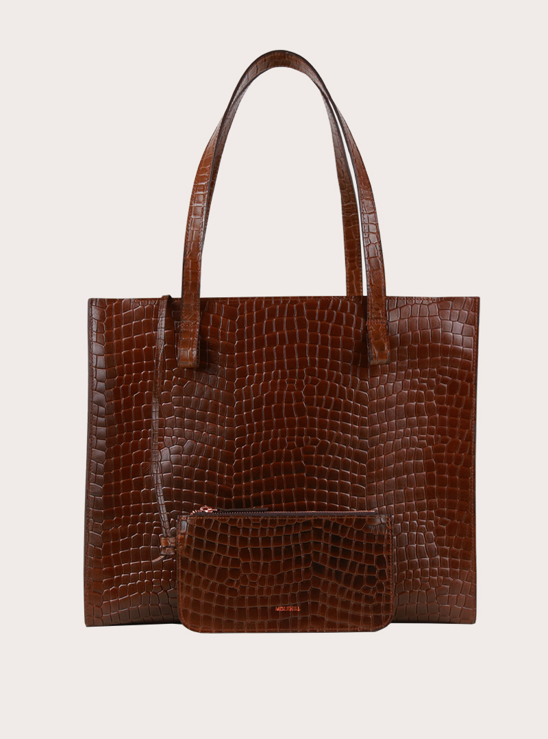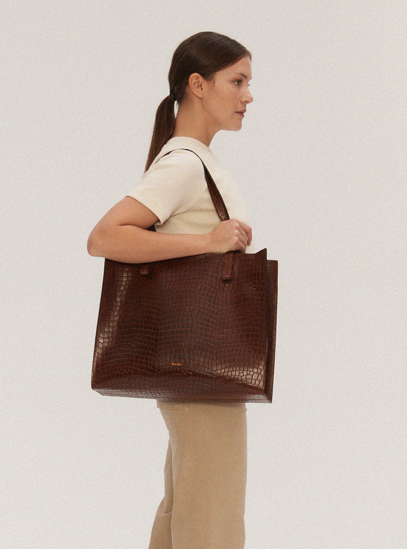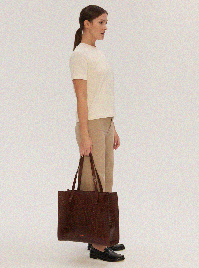 Shopper bag handmade from high-quality cowhide leather embossed with a crocodile skin pattern. Very spacious and perfect for everyday use. The bag fastens at the top with a copper zip and is complete with a removable pouch. You can wear it in two ways, by hand or over the shoulder. Logo in copper color embossed at the bottom edge.