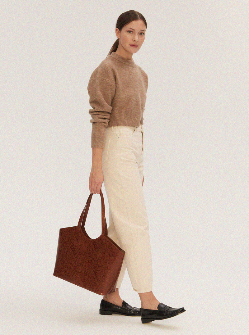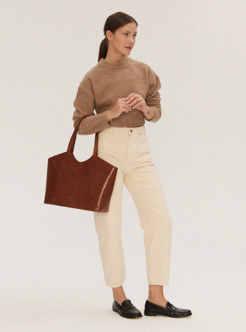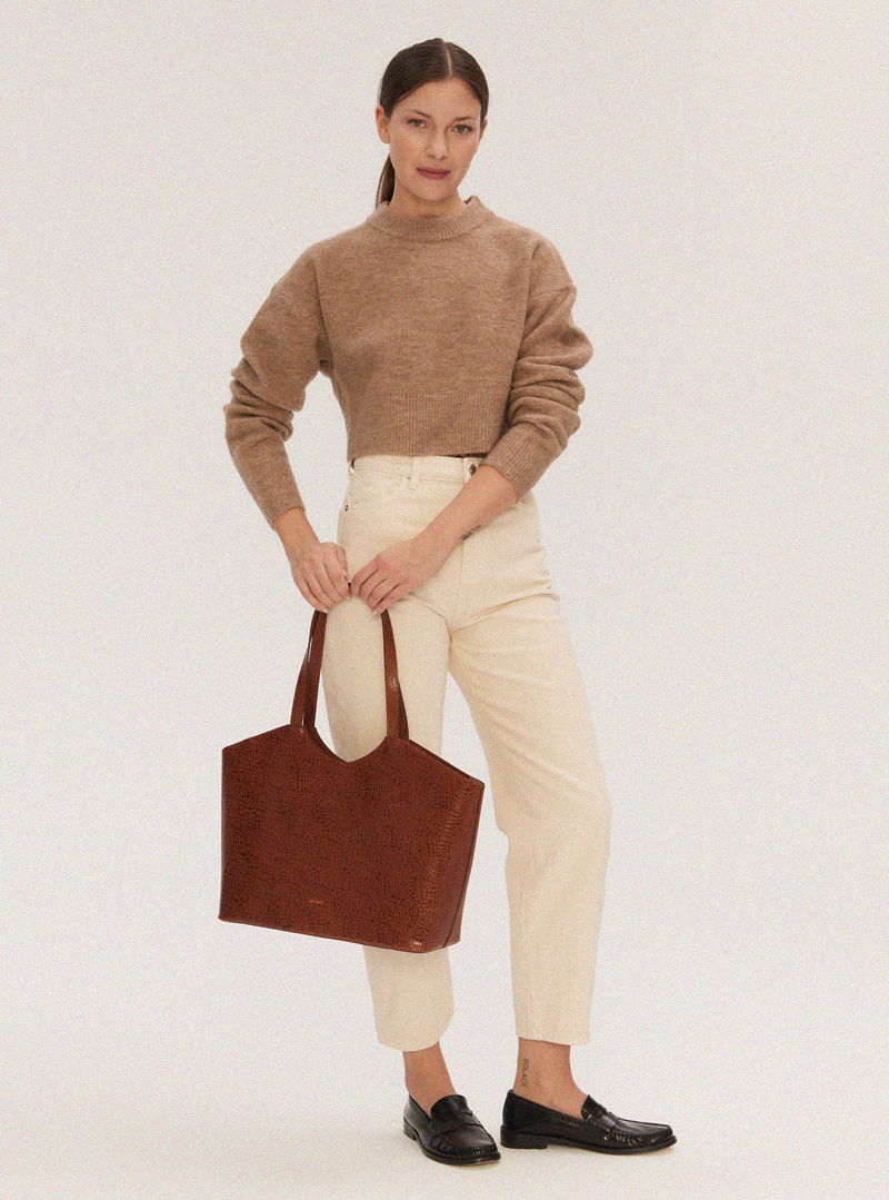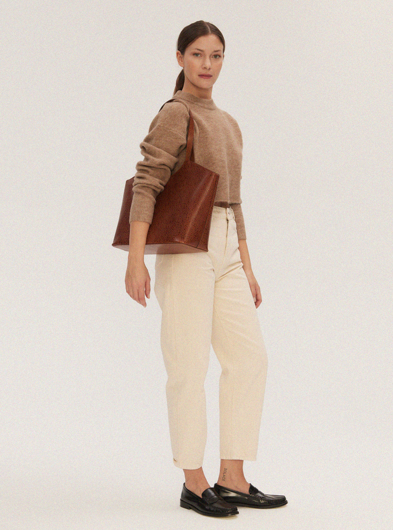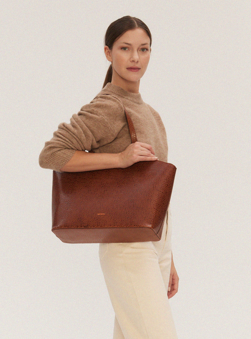 Shopper bag handmade from high-quality cowhide embossed with an irregular fine pattern. Very spacious and perfect for everyday use. The bag fastens at the top with a copper zip and is complete with a removable pouch. You can wear it in two ways, by hand or over the shoulder. Logo in copper color embossed at the bottom edge.