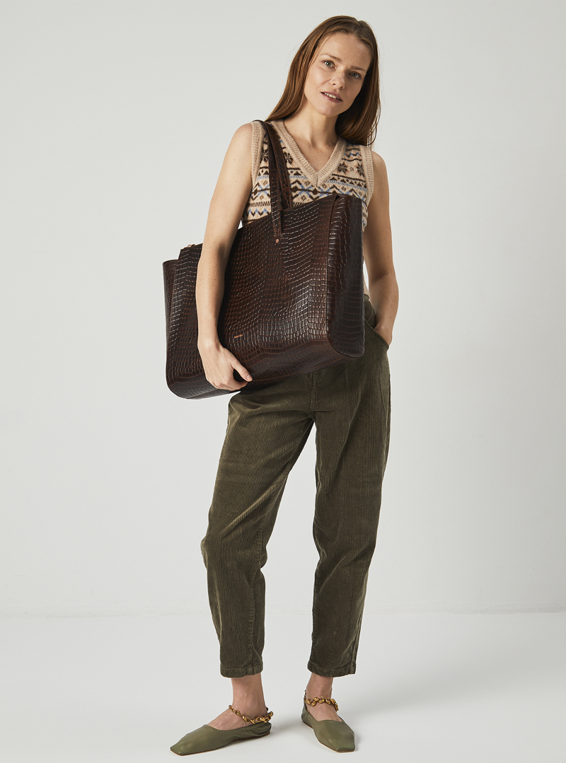 Weekender bag handmade from high-quality cowhide leather embossed with a crocodile skin pattern. The bag fastens at the top with a copper zip. You can wear it in two ways, by hand or over the shoulder. Internal pocket, logo in copper color embossed at the bottom edge.