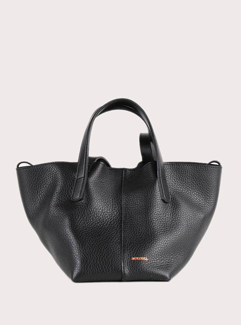 Torba wykonana ręcznie z wysokiej jakości groszkowej skóry bydlęcej. Posiada jedną otwartą komorę oraz usztywniane rączki. Zamykana na magnes oraz skórzane rzemyki. W komplecie wzmocnione mobilne denko, które można wyjmować w zależności od potrzeby. Torbę można nosić na ramię, crossbody lub w ręku. Logo w kolorze miedzianym tłoczone przy dolnej krawędzi torby.