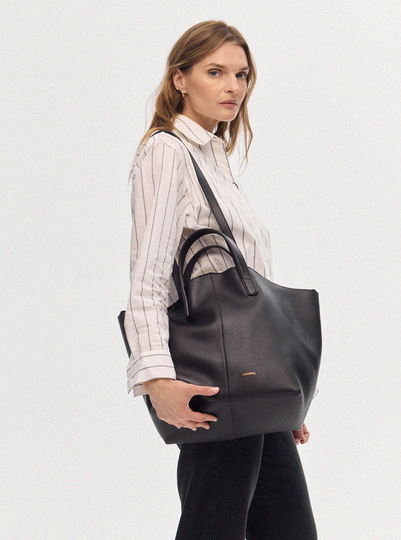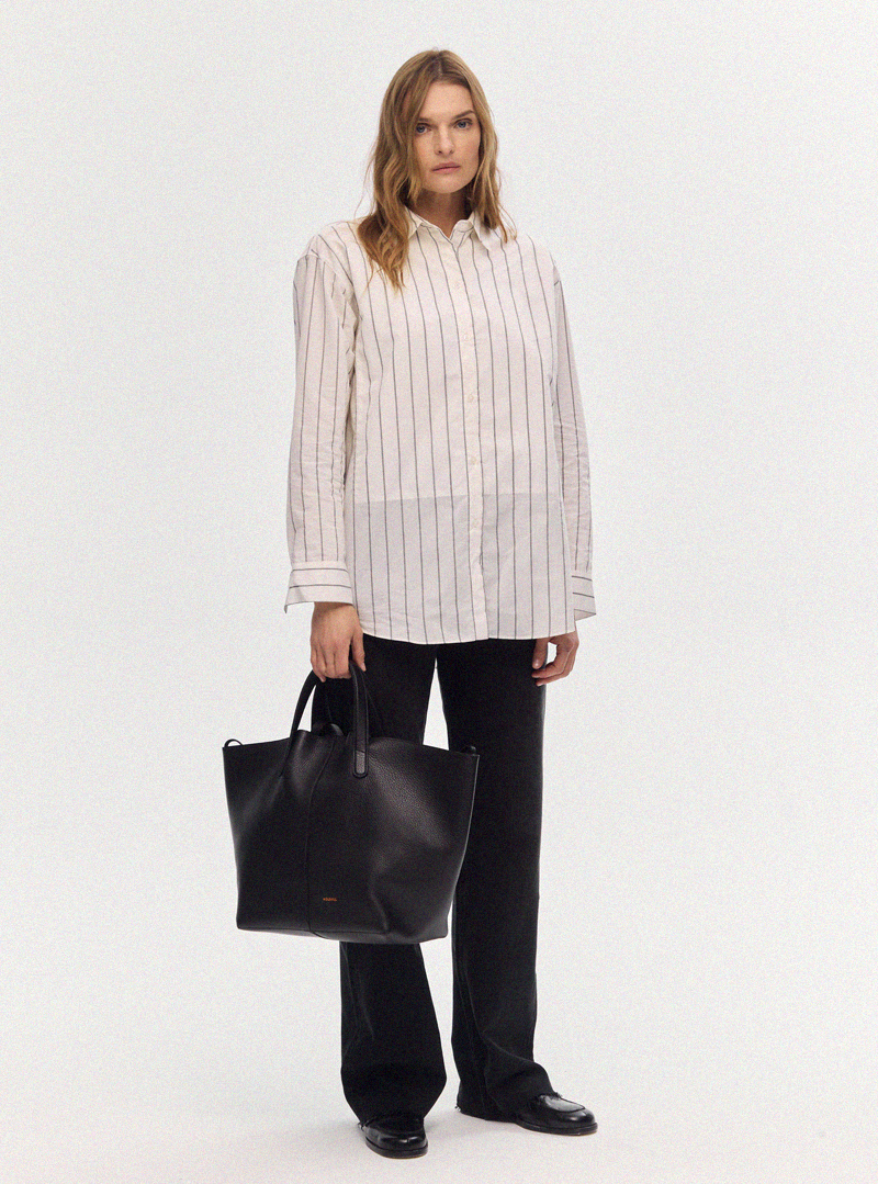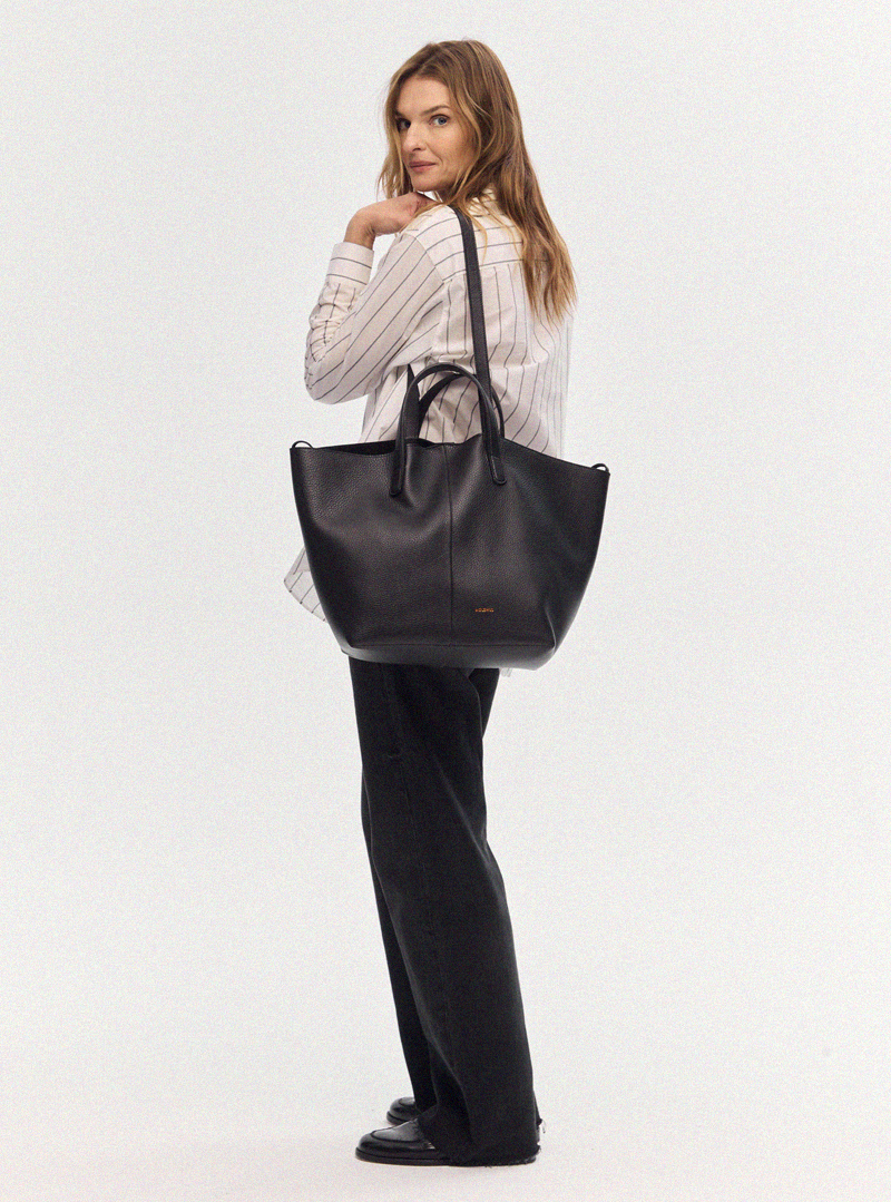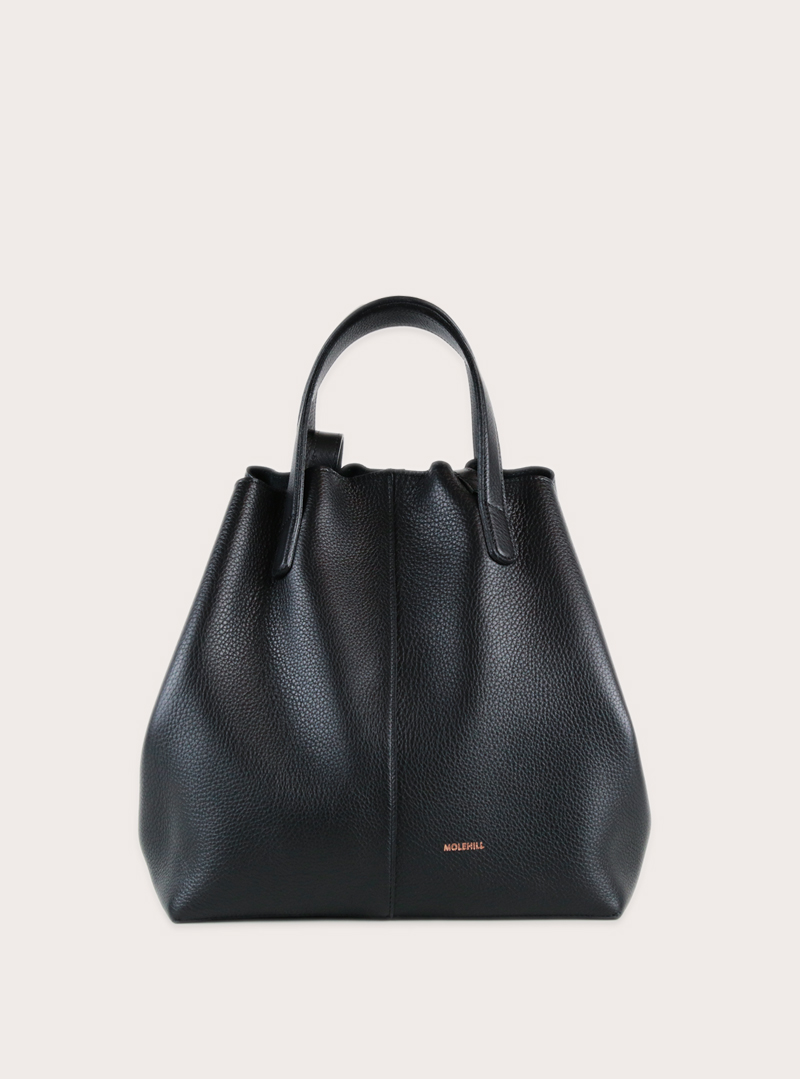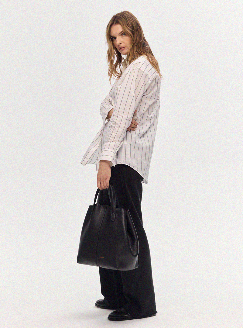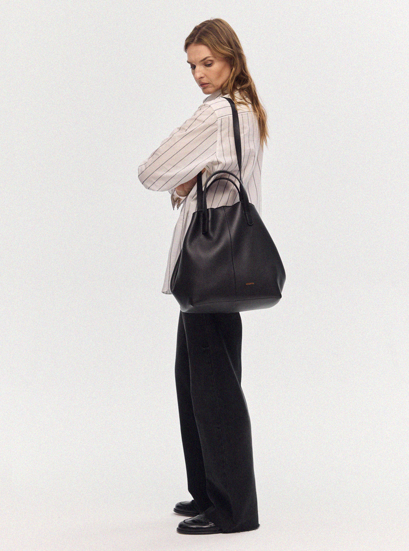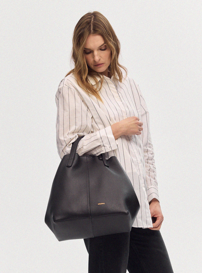 Torba typu shopper wykonana ręcznie z wysokiej jakości groszkowej skóry bydlęcej. Posiada jedną otwartą komorę oraz usztywniane rączki. Zamykana na magnes oraz skórzane rzemyki. W komplecie wzmocnione mobilne denko, które można wyjmować w zależności od potrzeby. Torbę można nosić na ramię, lub w ręku. Logo w kolorze miedzianym tłoczone przy dolnej krawędzi torby.