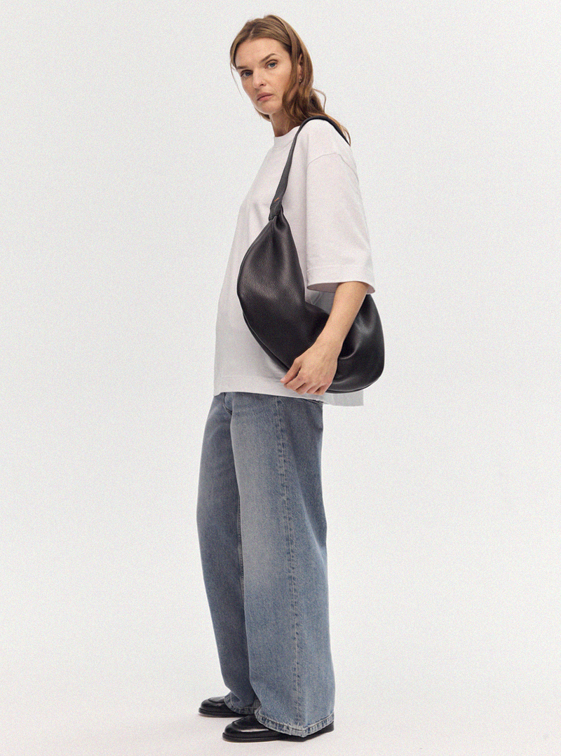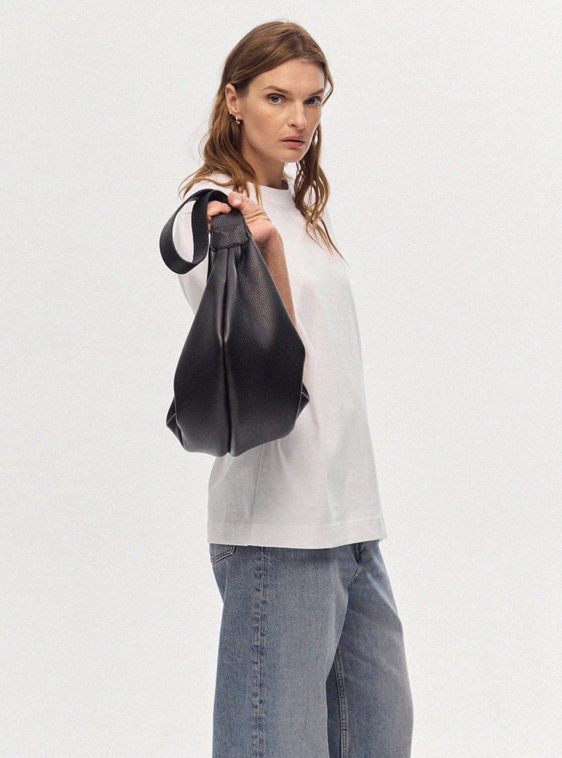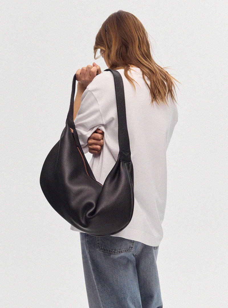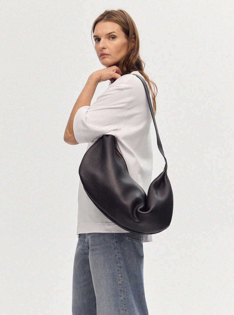 Średniej wiekości torba typu crossbody. Wykonana ręcznie z wysokiej jakości skóry bydlęcej garbowanej roślinnie. Zamykana od góry miedzianym zamkiem błyskawicznym. W zależności od potrzeb konstrukcja torby pozwala nosić ją na ramię, w poprzek klatki piersiowej lub w ręku. Subtelne logo w kolorze miedzianym tłoczone przy dolnej krawędzi paska.