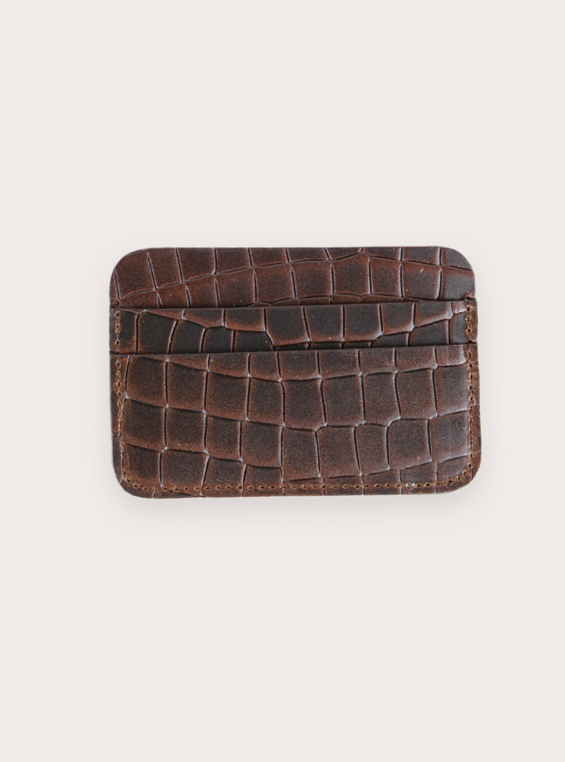 Etui na karty wykonane ręcznie z wysokiej jakości skóry bydlęcej tłoczonej we wzór skóry krokodyla. Posiada jedną dużą przegródkę, która pomieści karty i banknoty oraz dwie dodatkowe boczne przegródki na karty. Logo w kolorze miedzianym tłoczone przy dolnej krawędzi.