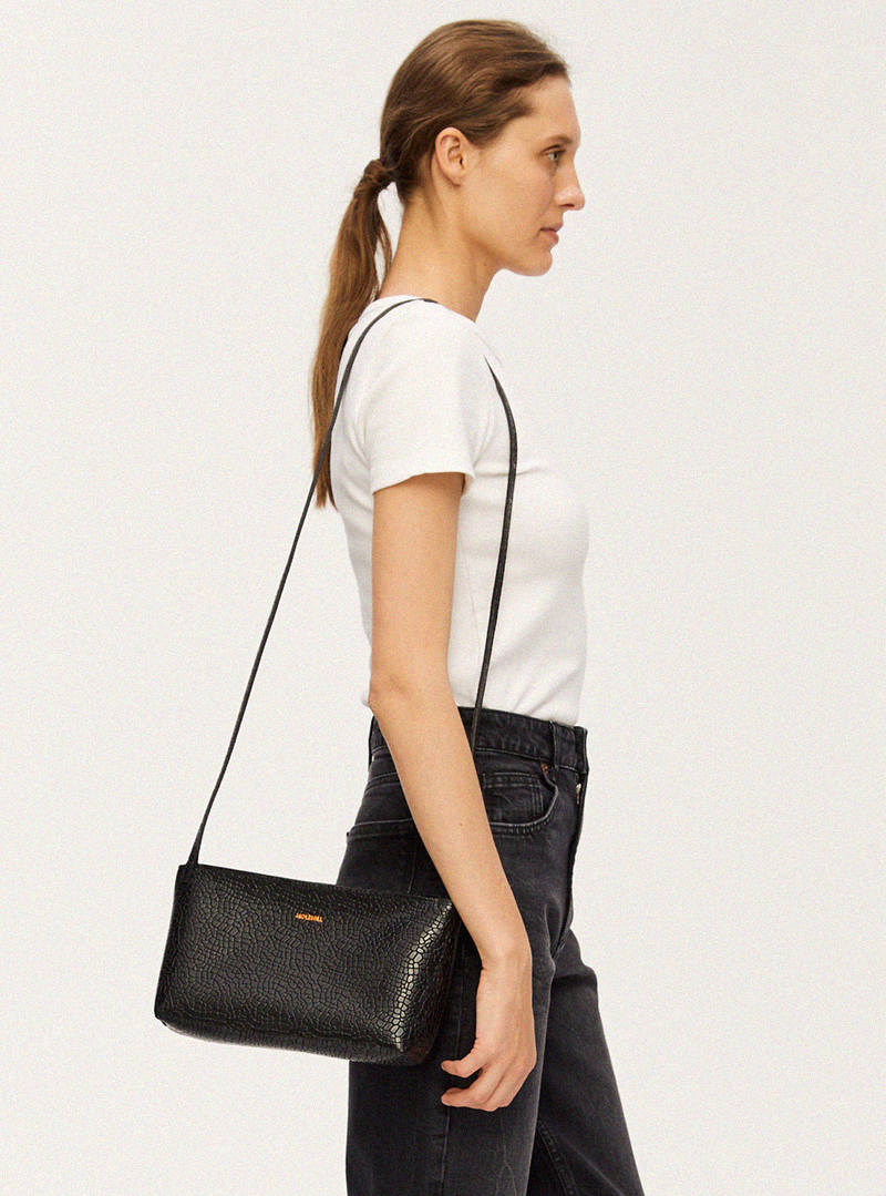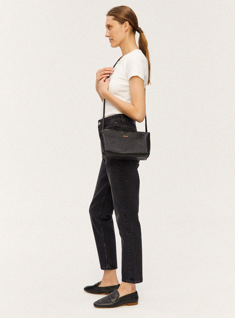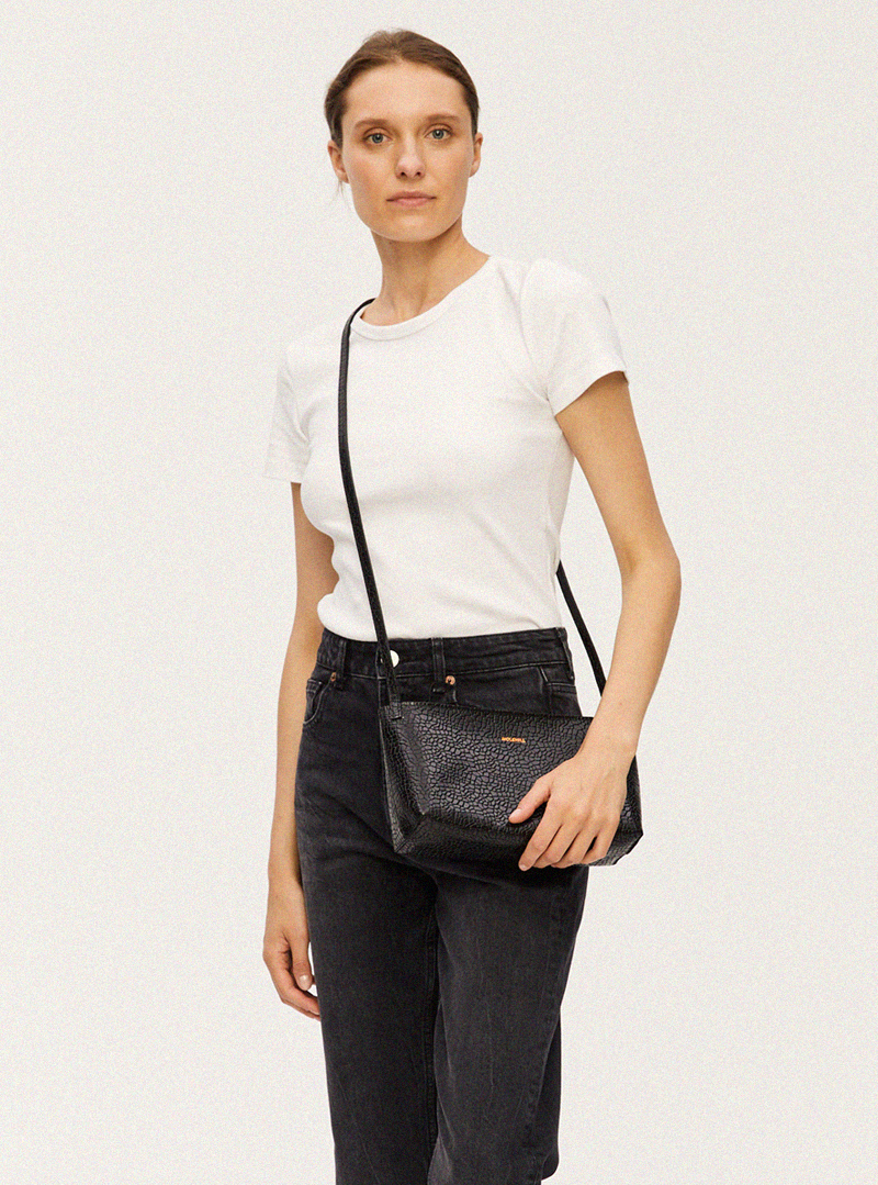 Torebka typu crossbody wykonana ręcznie z wysokiej jakości skóry bydlęcej tłoczonej w nieregularny drobny wzór. Zamykana od góry na zamek błyskawiczny w kolorze miedzianym. Bardzo pojemna, wewnątrz posiada jedną komorę. Można nosić ją na dwa sposoby, na ramię lub w poprzek klatki piersiowej. Logo w kolorze miedzianym tłoczone przy górnej krawędzi torebki.