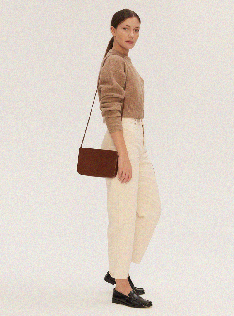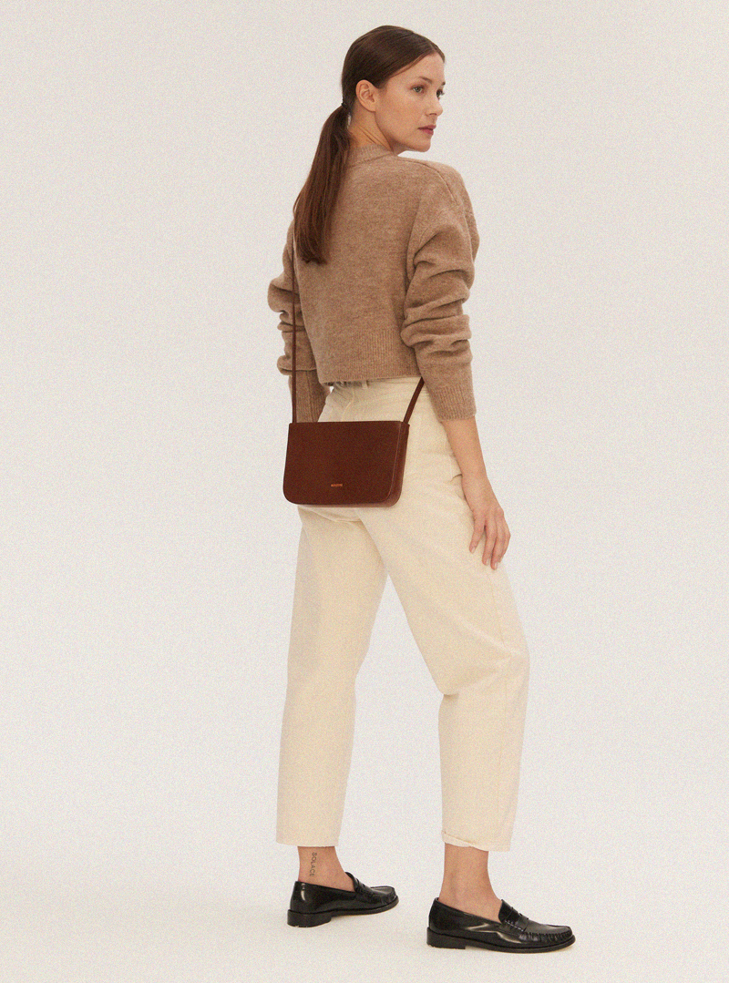 Torebka crossbody wykonana ręcznie z wysokiej jakości skóry bydlęcej garbowanej roślinnie. Zamykana od góry na zamek błyskawiczny w kolorze miedzianym. Posiada jedną komorę. Można nosić ją na dwa sposoby, na ramię lub w poprzek klatki piersiowej. Logo w kolorze miedzianym tłoczone przy dolnej krawędzi torebki.
