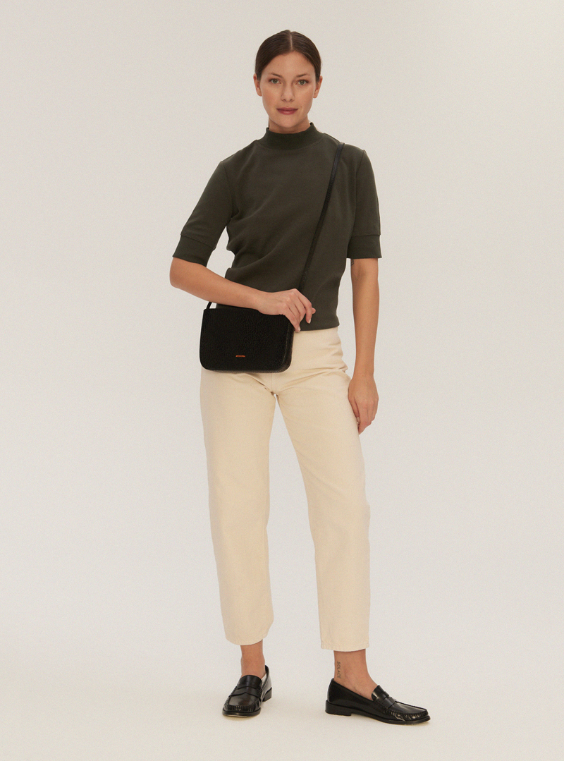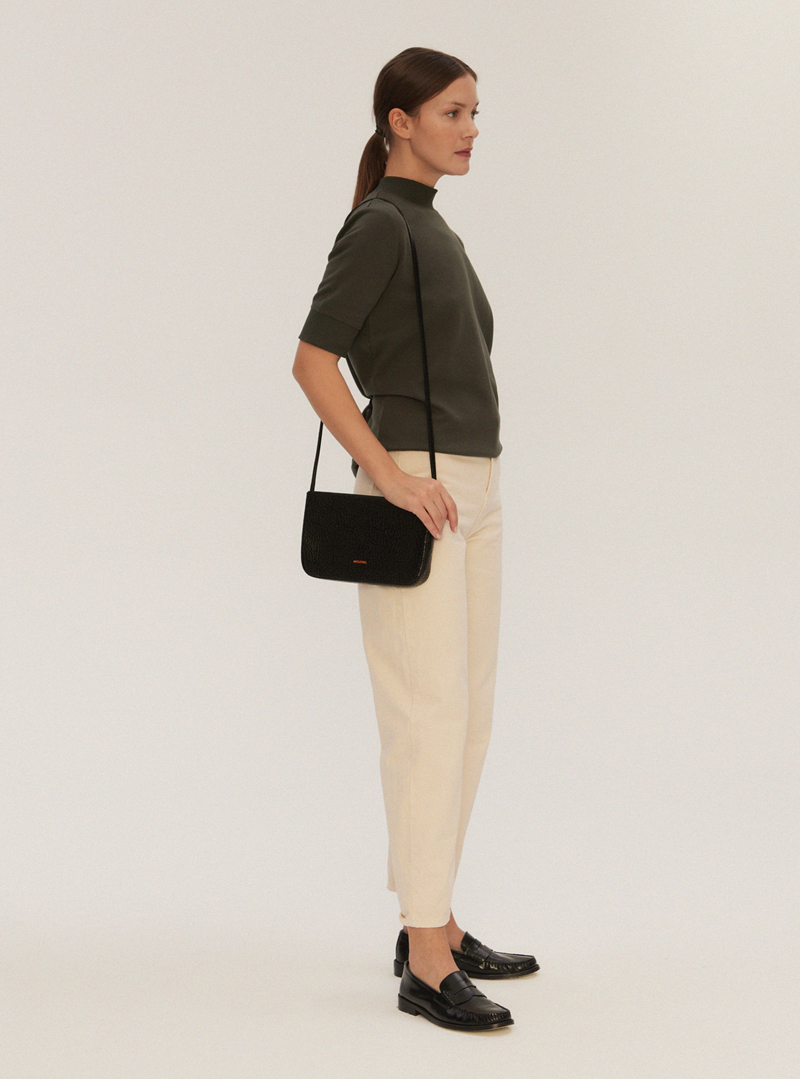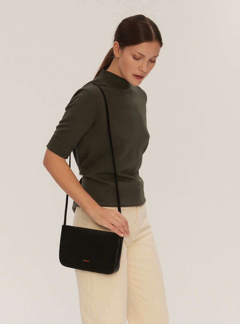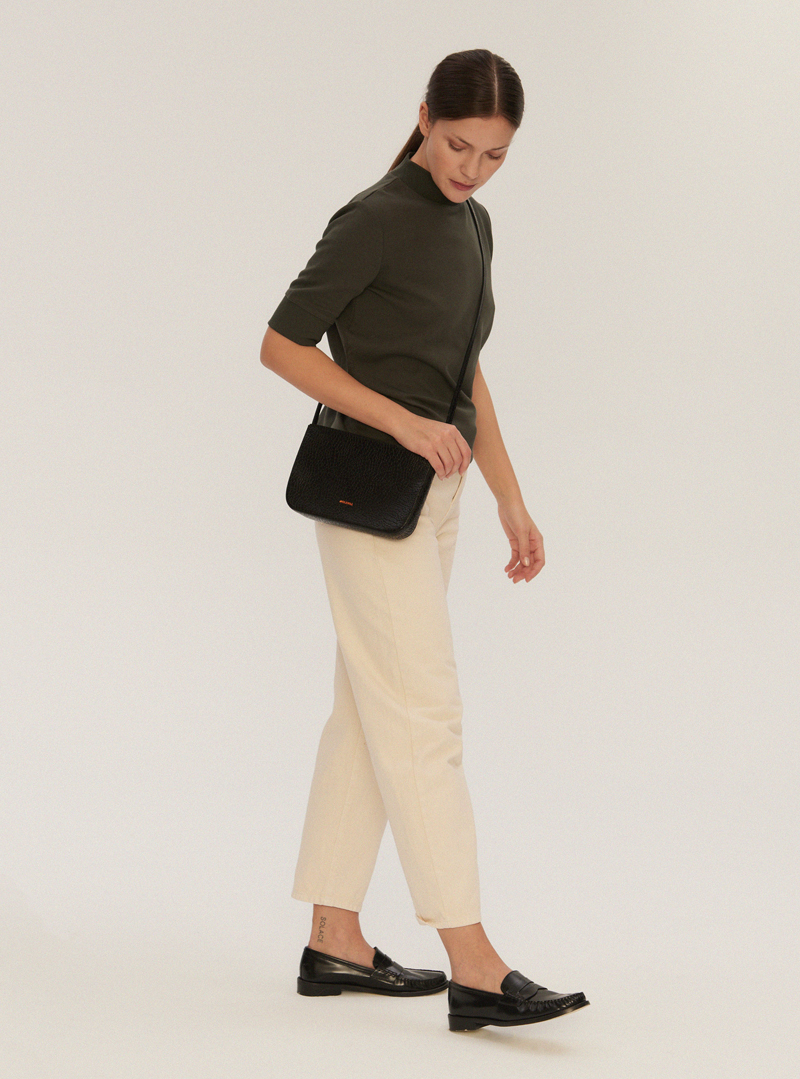 Torebka crossbody wykonana ręcznie z wysokiej jakości skóry bydlęcej tłoczonej w nieregularny drobny wzór. Zamykana od góry na zamek błyskawiczny w kolorze miedzianym. Posiada jedną komorę. Można nosić ją na dwa sposoby, na ramię lub w poprzek klatki piersiowej. Logo w kolorze miedzianym tłoczone przy dolnej krawędzi torebki.